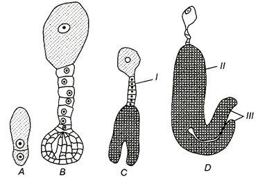 24.Identify the different stages in embryogenesis in the given diagram A,B,C and D