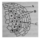 16.The given diagram shows microsporangium of a mature anther. Identify A, B and C.