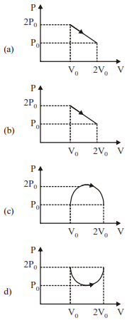 190. The P-V equation for a process of an ideal gas is given by P = $\frac{12P_0V}{V_0}-\frac{4P_0V^2}{V_0^2}-7P_0$ The graphical representation of the above process is shown is