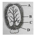 28.Identify the parts labelled as A, B, C and D in the given figure and select the correct option from the codes given below.